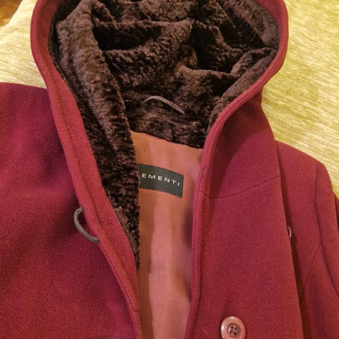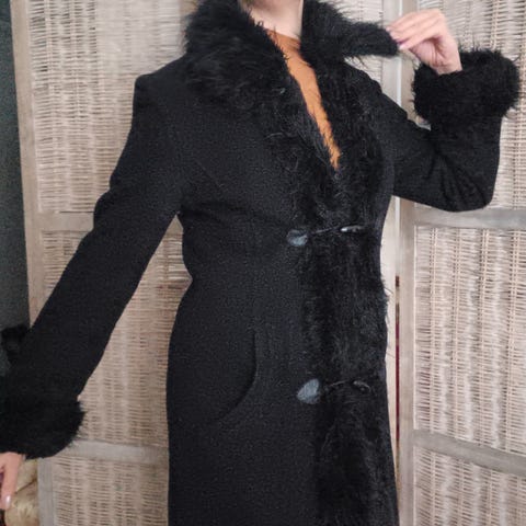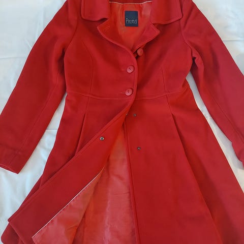 Myydään kuvan punainen villakangasviitta, jossa mustat tereet ja hienot korinpohjakuvioiset napit. Sivuilla taskut.