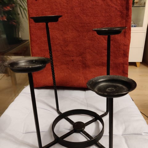 Myydään 3-haarainen lattiakynttelikkö, korkeus n. 100 cm. Yläosa 45 cm leveä.
