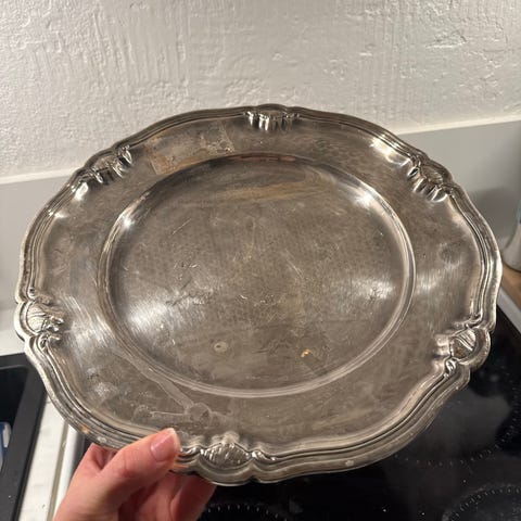 Jyväskylässä toimineen Hotelli Jyväshovin hopeoitu lautanen. Lautanen on 19430-luvulta. Lautasen paino 531g. Hopean määrä noin 3-5g.