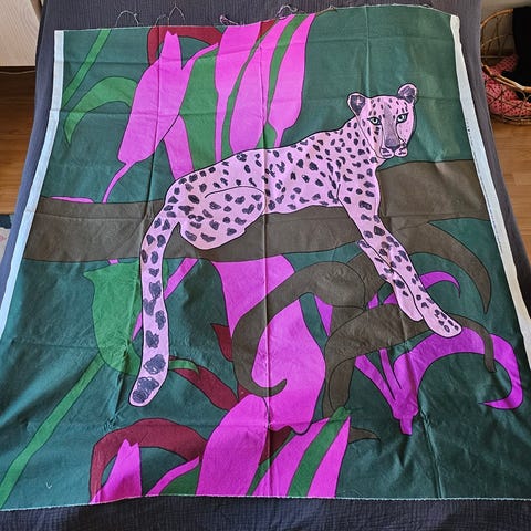 Kankaasta ommeltu Marimekon myymälässä tilaustyönä peiton päällinen, mutta tämän voisi käyttää myös kankaana. Sivusaumat purkamalla tästä tulee yhtäjaksoista kangasta lähes neljä metriä.