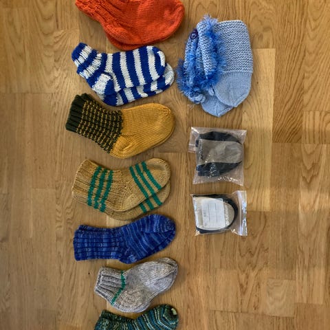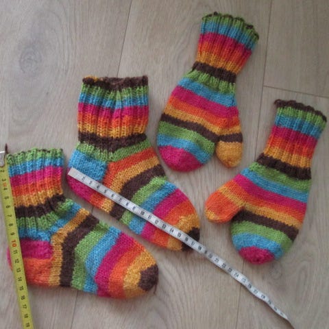 Kahdet 26-28 kokoiset villasukat, kerhotossut ja neljä talvipipoa, mitkä olleet käytössä 3-5-vuotiaalla.