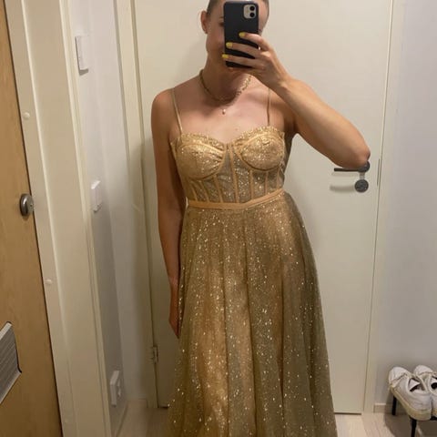 Iltapuku xs raakasilkkiä kultaloimella ompelimossa teetetty 162cm ja 50 kg mitoille, jalassa oli 7 cm korkokengät. Olkapäältä helmaan 138cm, vyötärö 63cm. Kaunis, yksinkertainen, laadukas. Sydämen muotoinen kaula-aukko, lyhyet hihat, vetoketju selässä, a-linjainen helma. Kerran ollut päällä, sen jälkeen pesulassa pesu.