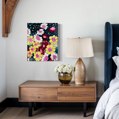 Iso työ, 120x100 cm, ja se on täyttä iloa. Värit on kirkkaat ja rohkeat. Tämä on just sellainen taulu, joka tuo huoneeseen hyvän fiiliksen ja muistuttaa niistä hetkistä, kun kaikki tuntuu just oikealta.