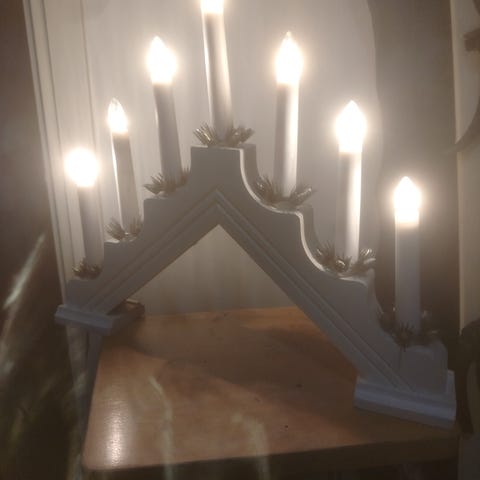 Valkea kynttelikkö, leveys 43cm, korkeus 38 cm.
