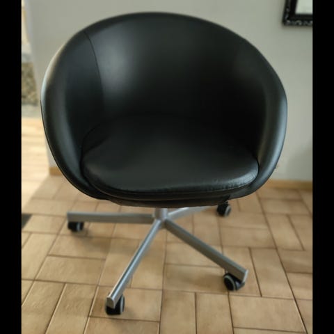 Upea tekonahkalla päällystetty musta työtuoli korkeussäädöllä ja pyörimismekanismilla. Ikeasta uutena 149 €. Toimii moitteettomasti. Selkänojassa ulkopuolella sauman kohdalla saattaa huomata pientä kulumaa, jos tarkkaan katsoo. Nouto Tampereelta.