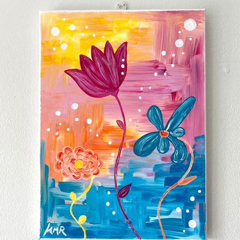 Kehystetty maalaus, joka esittää kukkakoria. Maalauksessa on käytetty monivärisiä sävyjä, ja se on asetettu mustaan kehykseen. Sopii hyvin sisustukseen tai taidekokoelmaan.