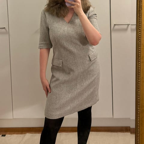 Myydään tummanharmaa mekko, jossa on taskut. Koko 40.