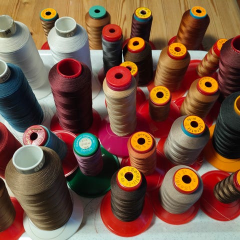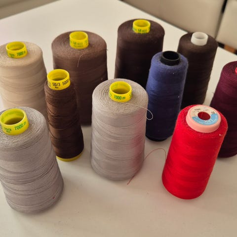 Saumurilanka, dmc . Vahvuus 100 eli peruslanka kotisaumuriin. Väri keskiharmaa eli sopii sekä vaaleampaan että tummempaan huolitteluun. Puolassa 5000 m. Laatikossa 6 rullaa, hinta 15 € .