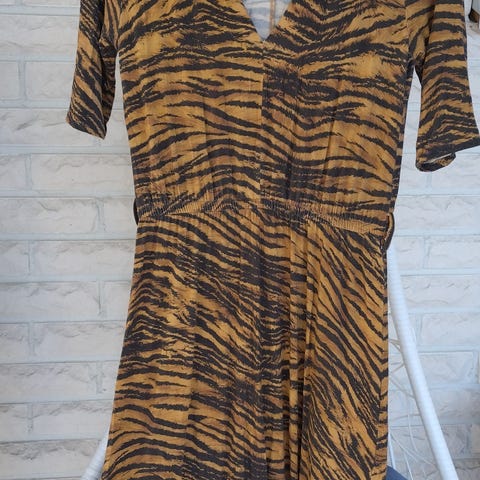 Hyväkuntoinen oranssi/ruskea/valkoinen Bandolera mekko. Kangas ohutta, liukasta ja erittäin joustavaa. Pituus 100cm. Kai-kai 47cm. Edessä alaosassa kaksinkertainen kangas ja pitkät halkiot molemmin puolin.