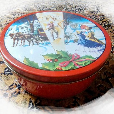 Jouluinen vanha peltirasia jonka korkeus 6,5 cm, halkaisija 19 cm.