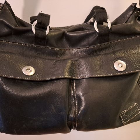 Tumman sininen Laukku, koko 28x38cm, pohjassa kanto kahvat ja säädettävä olkahihna, jossa olalle menevän osan kohdalla leveämpi pehmustettu vahvike, sisällä vetoketju tasku, edessä-ja takana vetoketju tasku, hyvä kuntoinen.