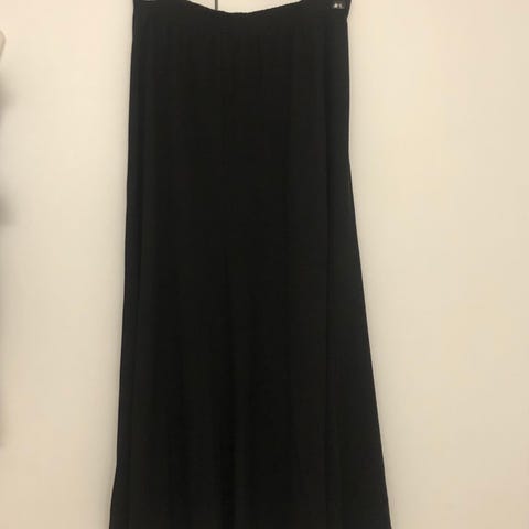 Musta pitkä hame halkioilla. 92cm pituus, vyötärö n. 100. Kokolappu L, vastaa kokoaan. Käyttämätön mielestäni. Made in Finland aikaa, kuvassa hieman ryppyjä säilytyksestä.