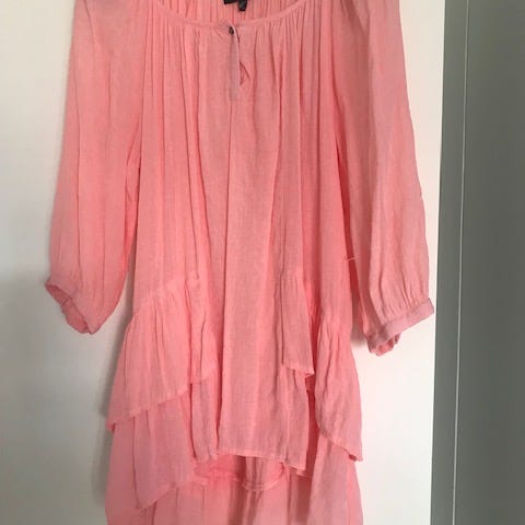Maksimekko, pussimaisilla hihoilla. Koko 42, mutta vastaa paremmin kokoa 40. Hihoissa kiinnitys napeilla. Mukana yksi varanappi. Vasemmassa kyljessä suljettava vetoketju. Kangas on täysin peittävää eikä jousta. Etupuolella helman keskellä on halkio. Kankaan väri näyttää tummemmalta kuin kuvissa. Kankaassa on kiiltävämpiä kuvioita, joista lähikuva.