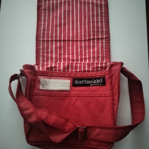 Marimekon hyväkuntoinen ja ehjä laukku paksua puuvillaa. Puiset kahvat, vetoketju ja sisällä vetoketjullinen ehjä sivutasku. Postikulut lisätään tai nouto. Myynnissä myös muualla.