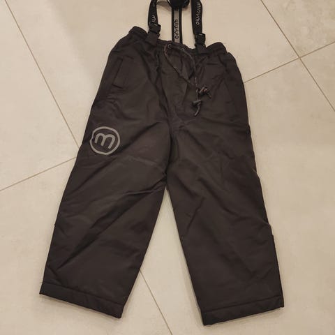 Mikk-line mustat toppahousut koossa 98. Siistikuntoiset, kauppareissulla käytetty. Säädettävät henkselit,, lumilukot lahkeensuissa, alkuperäiset silikonijalkalenksut, vyötäröllä kuminauhasäätö. Saa otettua henkseliosan kokonaan pois, eli pystyy käyttämään pelkkinä housuina.