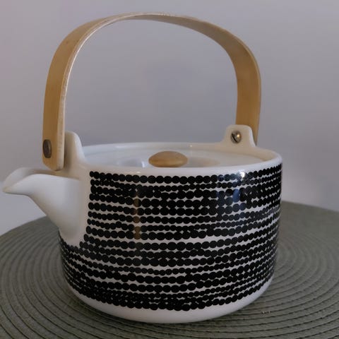 Marimekko Sääpäiväkirja teekannu, valkoinen/musta/keltainen, materiaalina posliini. Käytetty kerran, todella hyvässä kunnossa, jotain pientä kulumajälkeä (näkyy kuvissa).