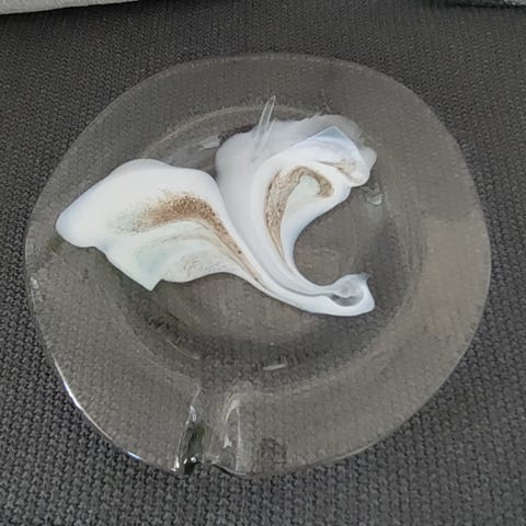 Taidelasiseppien valmistama keräilykappale. Halkaisija 12,2 cm, korkeus 2,5 cm. Nouto Helsingin Kampista.