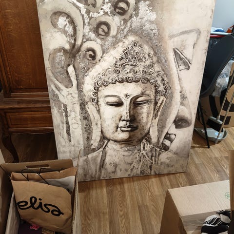 Iso kankaalle maalattu Buddha-taulu. Koko 118x149. Uniikki Balilta tuotu kangas joka on Suomessa kehystetty. Olen ostanut tämän Suomesta valmiiksi kehystettynä.