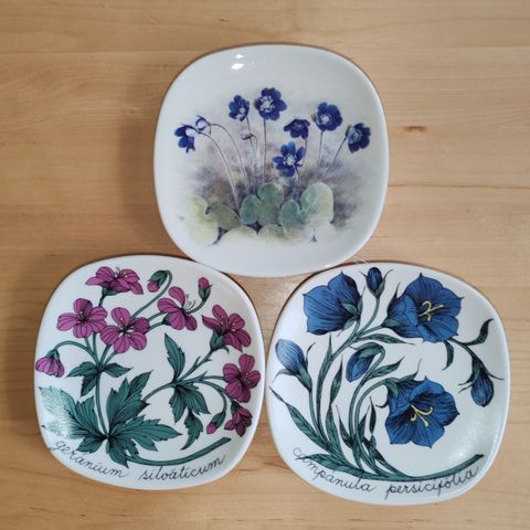Savipaja Eeva Maijan käsityötaidetta, kaksi kukkakuvioista, syvää lautasta/kulhoa sekä