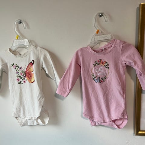 Vaaleanpunainen kietasubody ja valkoinen kaulusbody, jossa kukkakirjailuja. Valkoisessa takana kukan muotoiset napit. Pesty vauvan vaatteiden pesuaineella Erisan baby. Siistikuntoiset seuraavalle pienelle!