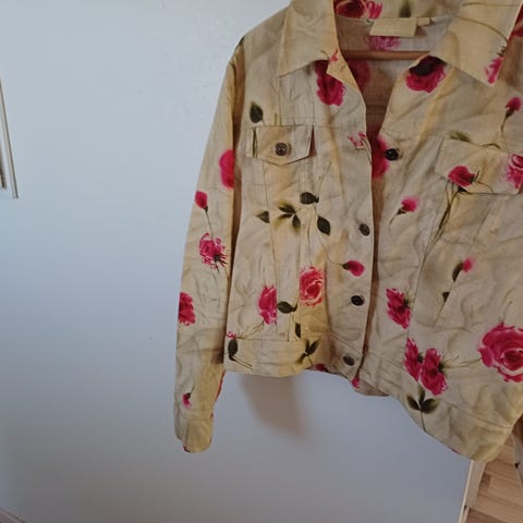 Kuvanmukainen jakkutakki, vihreä, hihat ei täyspitkät. Mahdollisesti pellavaa päälliosa, ei lappuja.