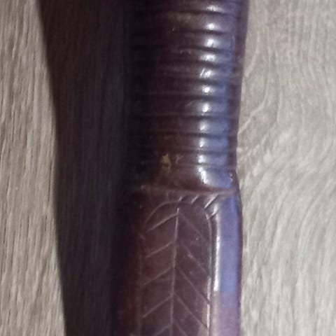 Erikoinen iso puukko hirvensarvi tai kauriinsarvi kahvalla ja puisella tupella.