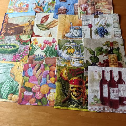 Ihanat servetit kattauksiin, decoupage- , kortti askarteluun; oman harrastuksen hiipuessa. Ihania kuva-aiheita, syksy, kevät, kesä, talvi, joulu, pääsiäinen, synttärit, kukat, eläimet, yms.