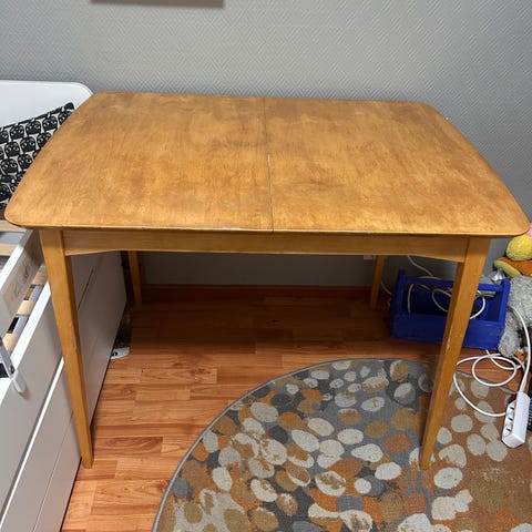 Kauniisti kulunut 40-luvun koivupöytä. Kannessa halkeama,kaipaa liimausta( viimeinen kuva). Etupuolella laatikko. On mahdollista ostaa erikseen kuvassa oleva 5mm reunahiottu lasi 60×80cm, 50e.