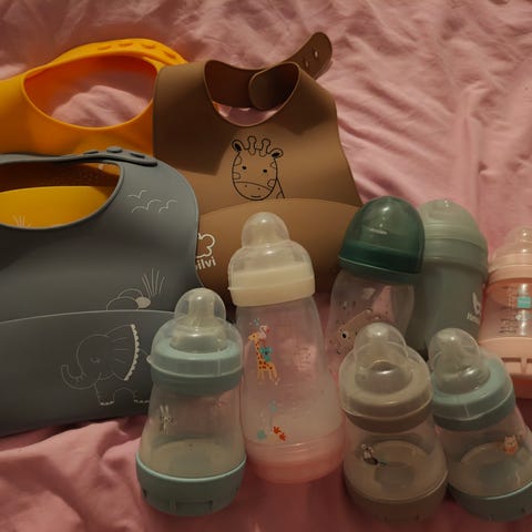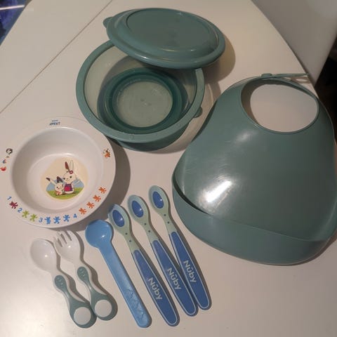 Vauvan ruokailusetti (tuttipullo, välipalapussit, nokamukki, lusikat)
