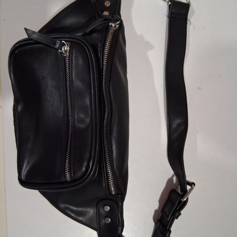 Hyväkuntoinen musta-pinkki vyölaukku.