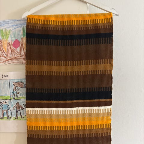 Värikäs 70-luvun seinäraanu tai keinutuolin matto.