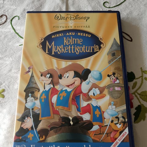 Myynnissä kuvan Kolme muskettisoturia-DVD. Kaikki pitäisi toimia normaalisti. Mikki, Aku ja Hessu