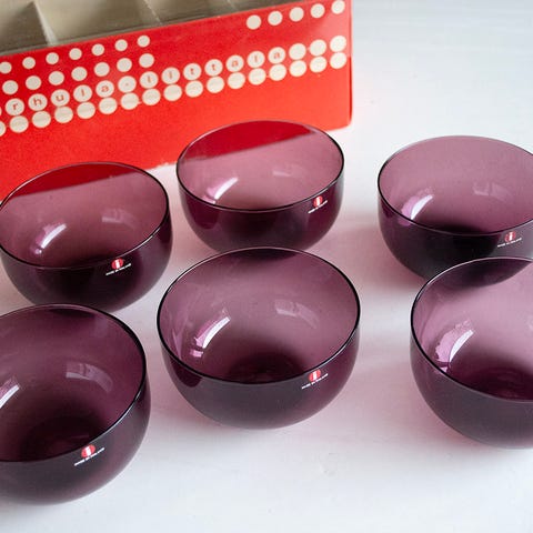 Edullisesti todella kaunista kotimaista lilaa vintagelasia eli kahdeksan jälkiruokamaljaa, todella kaunis ja harvinainen setti, Karhula-Iittala, design Saara Sappinen 1950-1960. Ikäisekseen erinomaisessa kunnossa.