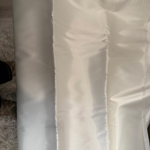 Kangaspala 140 cm leveää kiiltosamettia viiden metrin verran. Joustaa. Sopii esim. pöytäliinoihin, tyynyihin, koristeluun. Oli väärän sävyinen omaan projektiin, siksi käyttämättömänä myyntiin. Kylmä valkoinen, jopa hieman hopeaan taittava. Tästä saisi esim juhlaan helposti pöytäliinoja. 😊