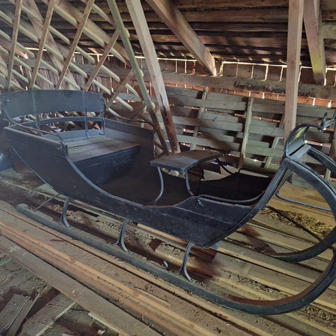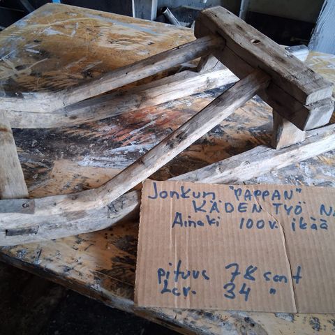 Kuvien vanha tukkireki kuvanmukaisessa kunnossa, sääsuojassa varastoitu.