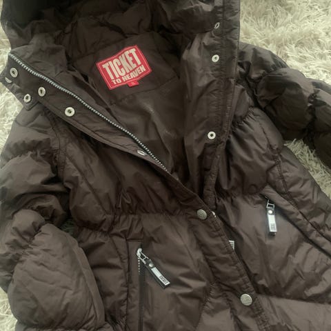 Myydään vasleanpunainen lasten untuvatakki Ticket to heaven. Irrotettavat hihat ja huppu. Pientä pinttymä näkyy, jos tarkkaan katsoo. Edessä on ollut pieni viilto, se on ommeltu.
