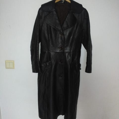 Linjakas takki. Pituus 106 cm., vyötärö 92 cm. Lantio 104 cm. Aitoa nahkaa kevääseen ja syksyyn. LÖYTÖ !