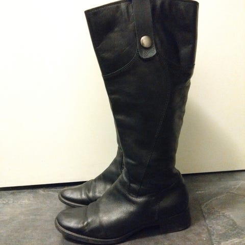 Unisa korkeakorkoiset, konjakinruskeat saapikkaat, koko 37, vastaavat kokoaan. Saapikkaiden alaosa on nahkaa, varsi todella pehmeää tekoturkista. Koron korkeus 8 cm. Päkiän alla olevan korokepohjan korkeus 1,5 cm. Varren korkeus suorana takaa, koron yläreunasta on 23 cm. Varren ympärysmitta on 39 cm. Sisämittaa on hankala mitata, mutta se on noin 24 cm. Hyvässä ja siistissä kunnossa.