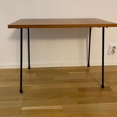 Pöytälevyn pinta on pääsääntöisesti hyvässä kunnossa, kulmassa kulumaa. Jalassa kulumaa. Huomioitu hinnassa.