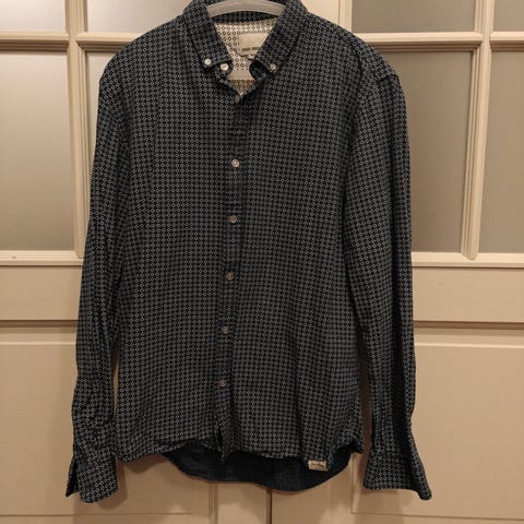 Myytävänä erittäin vähän käytetty ja uudenveroinen hieno kauluspaita, jossa on kaksi napillista rintataskua. Paidassa ei ole kokolappua, mutta se on arviolta M-kokoinen.