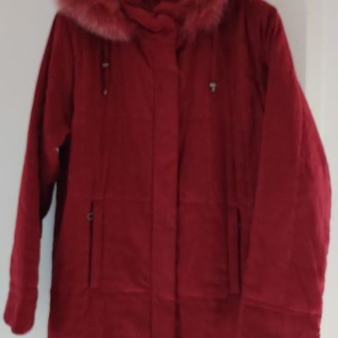 Halosen talvitakki hupulla(karva hupun reunoilla)povitasku,vetoketju taskuissa ja neppareilla.