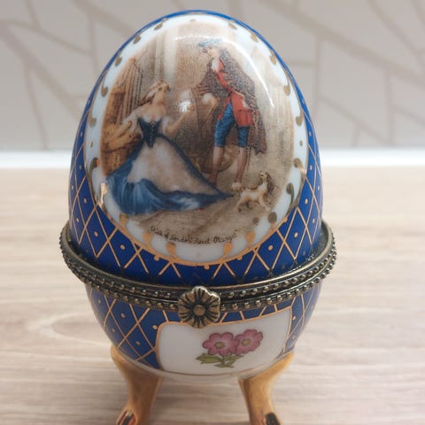 Kaunis ja hyväkuntoinen koristemuna puutelineellä, materiaali emaloitua metallia, Cloisonné eli soluemalia. Emalointi on perinteistä kiinalaista käsityötä.