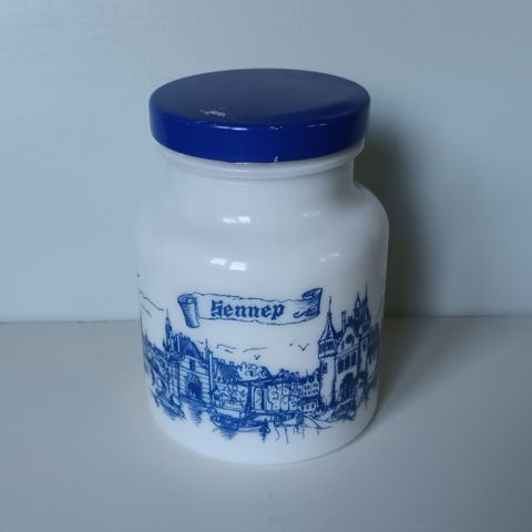 Valkoinen sinappi tms. tarjoiluastia, jonka kannessa kolo lusikalle