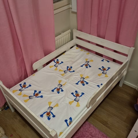 lasten kuvan mukainen jatkettava sänky, pisimmillään saa aikuisen sängyn pituuteen. Vaahtomuovipatjan (170cm) saa mukaan halutessaan 10e hintaan. Leveys sopii 80cm leveälle patjalle(laidan leveimmästä kohdasta n.84cm). Patja ei kuulu hintaan.