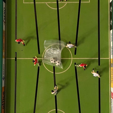 Myydään jalkapallopelipöytä, jossa on musta ja puinen viimeistely.