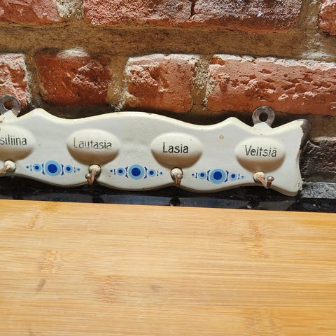 Vanha koristeellinen naulakko/ pyyheteline, leveys 46cm, korkeus 16cm.