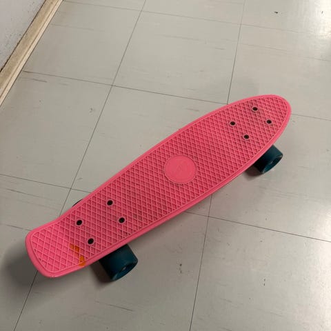 Penny Cruiser -tyylinen rullalauta, jossa on sininen muovinen kansi ja punaiset renkaat. Rullalauta soveltuu vapaa-ajan käyttöön ja kaupunkiajoon.
