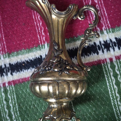 Messinkinen kannu ja 6 kpl kynttilänjalkoja. Kannun korkeus 46 cm ja leveys 25 cm, pohjassa merkintä INDiA 5829. Hinta 250/tee tarjous.