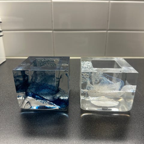 Ruotsalaista Kosta Boda design lasia. Erittäin hyväkuntoiset koboltin siniset Atoll kynttilälyhdyt, joissa kauniit aaltomaiset värit.