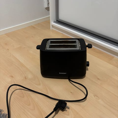 täysin toimiva pirteän värinen leivänpaahdin, joka "polttaa" toiseen paahtoleipään auringon ja toiseen hymiön.